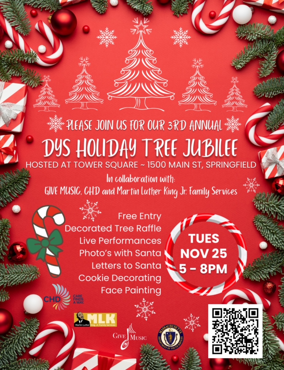 This year’s festivities will be held at Tower Square, 1500 Main St, Springfield on Tuesday, November 25th, from 5 PM to 8 PM! CHD’s Community Services Network (formerly the Adolescent Re-Entry Program) is partnering with the Massachusetts Department of Youth Services (DYS), Martin Luther King Jr. Family Services,and Give Music for a special event this holiday season to bring you an unforgettable evening that is FREE and open to the public.